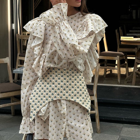 Elegant Printed A-Line Mini Dress - Ruffle Panel Sleeves