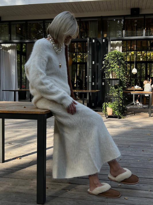 Women’s Twist Stitch Sweater and Midi Skirt Set – Long Sleeve Crew Neck Sweater with Pockets