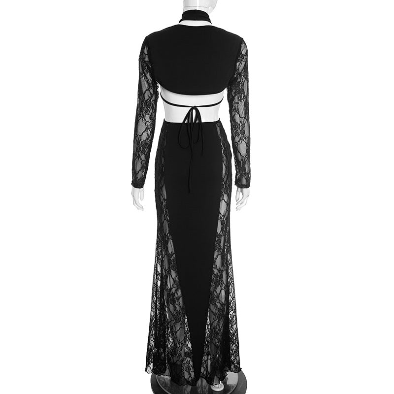 Black Hollow Out Cutout Maxi Dress – Sexy Halter Lace Long Sleeve Bodycon Dress