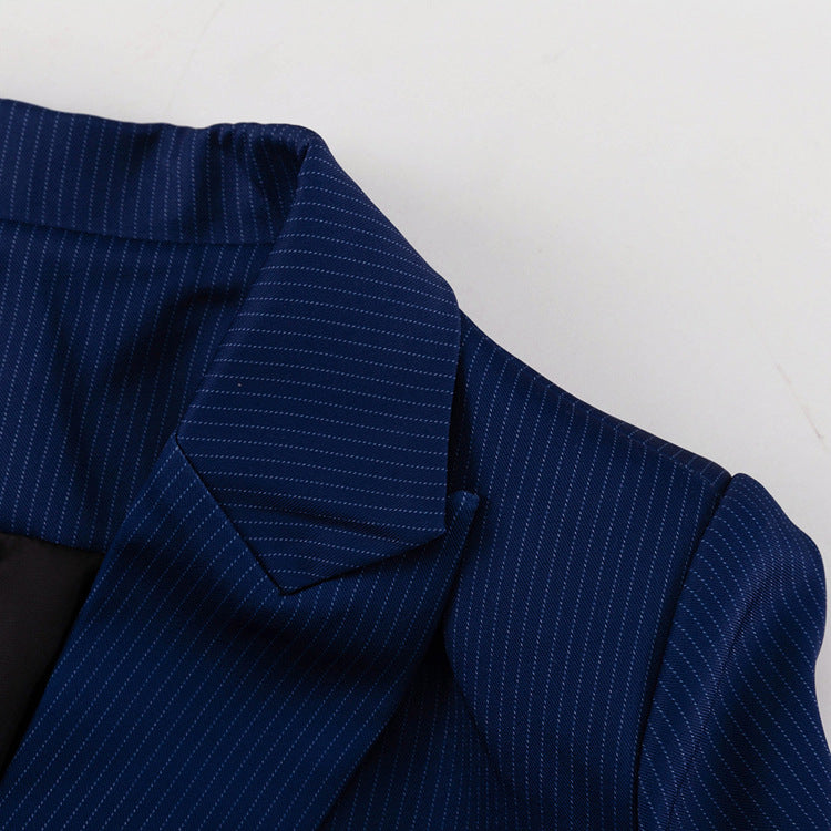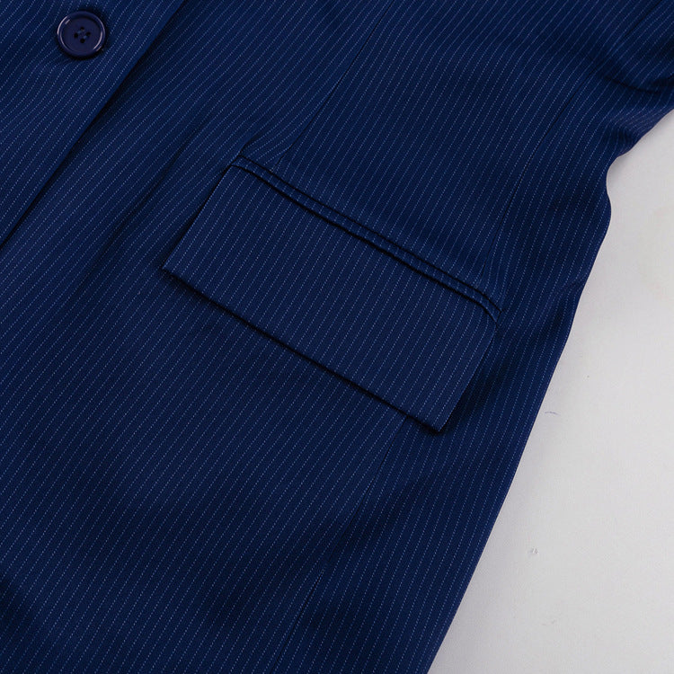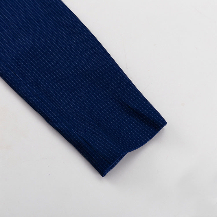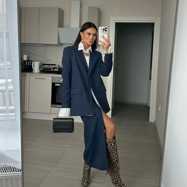 Elevate your style effortlessly with this Elegant Striped Midi Skirt Set. Featuring a loose-fit, long-sleeve collared top paired with a high-waist midi skirt that includes a chic side split, this set blends comfort and sophistication. Crafted from a soft polyester blend, it adapts seamlessly from professional office settings to elegant special occasions, ensuring you always look polished and confident.