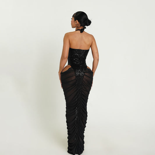 Women's Sequin Mesh Halter Cutout Maxi Dress with Ruffles