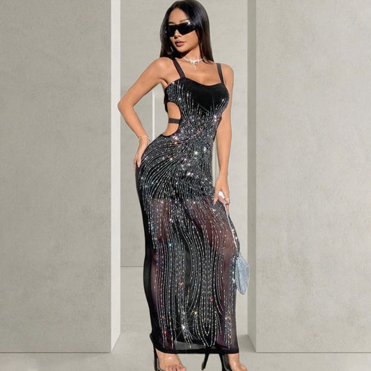 Women's Rhinestone Cutout See-Through Maxi Evening Dress