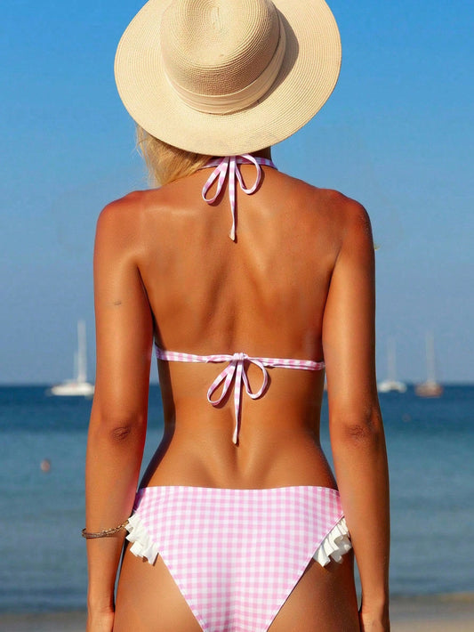 Lace Plaid Halter Bikini Set - Flounced Two Piece Swimsuit