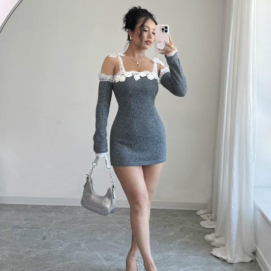 Gray Lace & Crochet Off-Shoulder Dress: Knitted Wool Mini/Midi with Sleeves