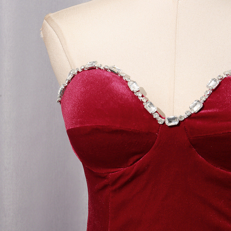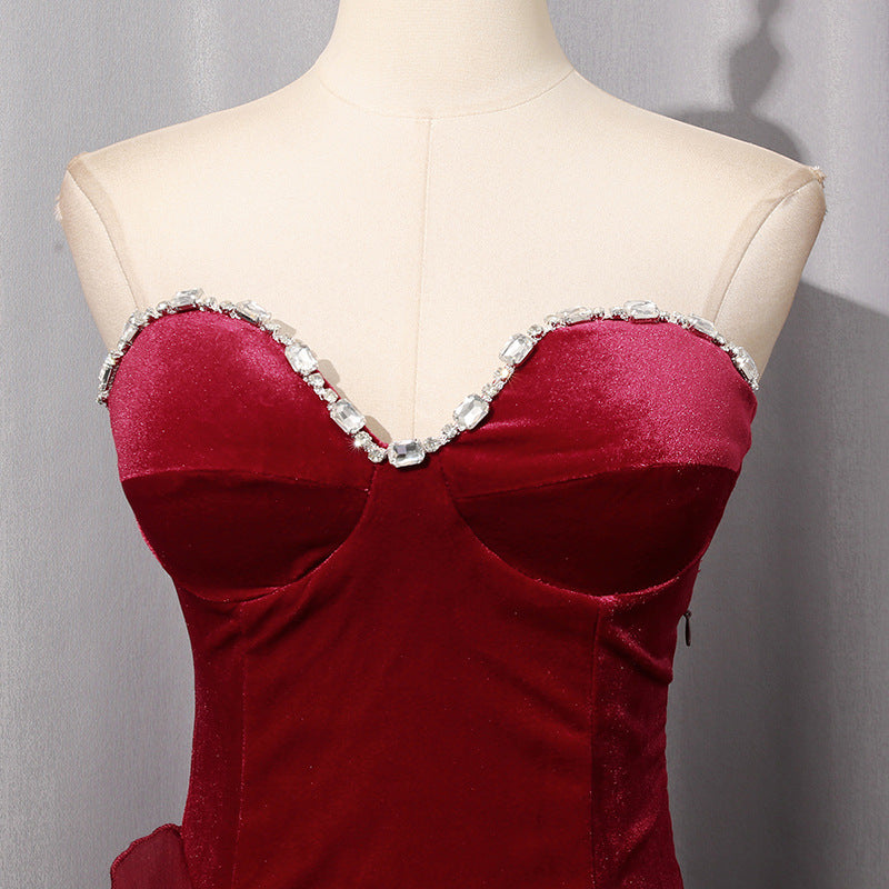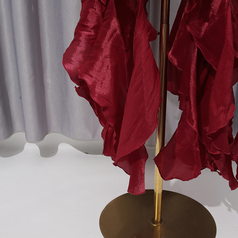 Step into refined glamour with this wine red rhinestone ruffled evening dress, designed to blend timeless elegance with a bold, modern edge. Perfect for women who love statement silhouettes with a luxe finish.