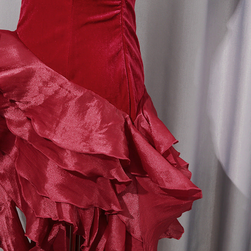 🍷 Ruby Luxe Rhinestone Ruffle High-Low Dress