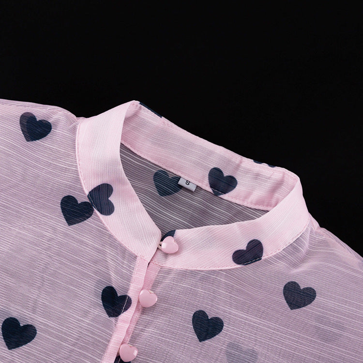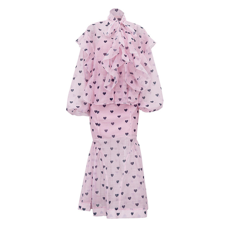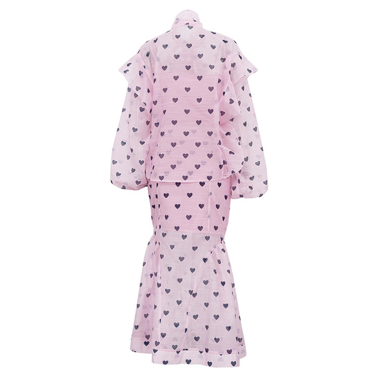 Women’s Three Piece Skirt Set – Elegant Heart Print Top and Maxi Skirt