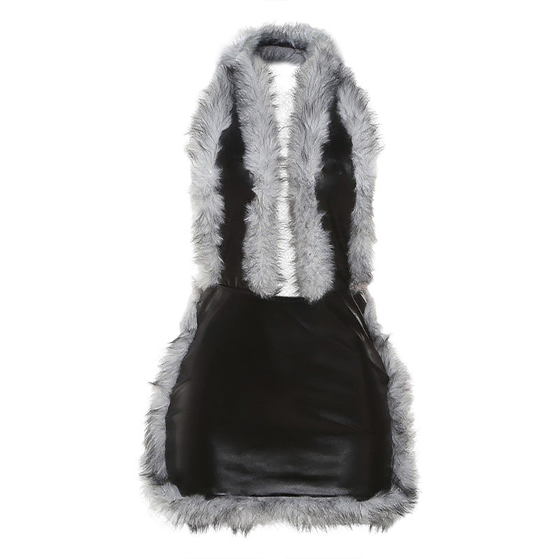 Faux Leather Halter Dress: Deep V Plunge Neck with Fur Trim Stitching