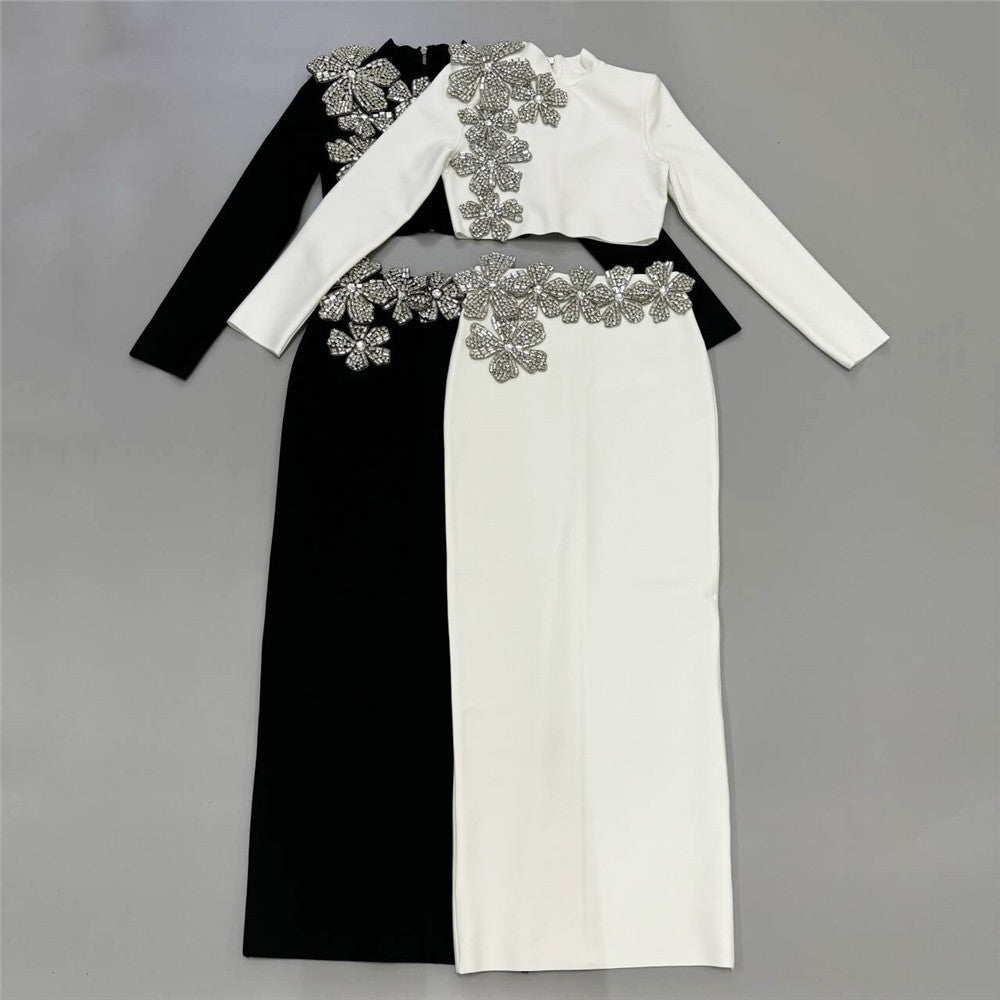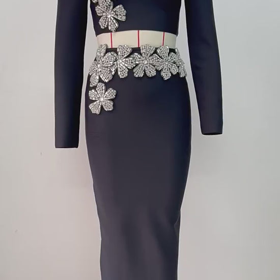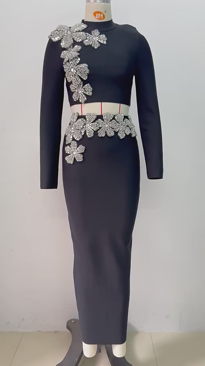 Turn heads this season with this Luxury Black Half-Turtleneck Long Sleeve Bandage Skirt Set. The slim, bodycon fit sculpts your silhouette, while the floral pattern and 3D rhinestone decorations add irresistible glam. Featuring a high-rise maxi skirt with an asymmetric split and a zip closure, this two-piece set blends elegance with daring allure. Crafted from soft polyester, it ensures comfort through spring and fall, making it the perfect statement for your next night out.
