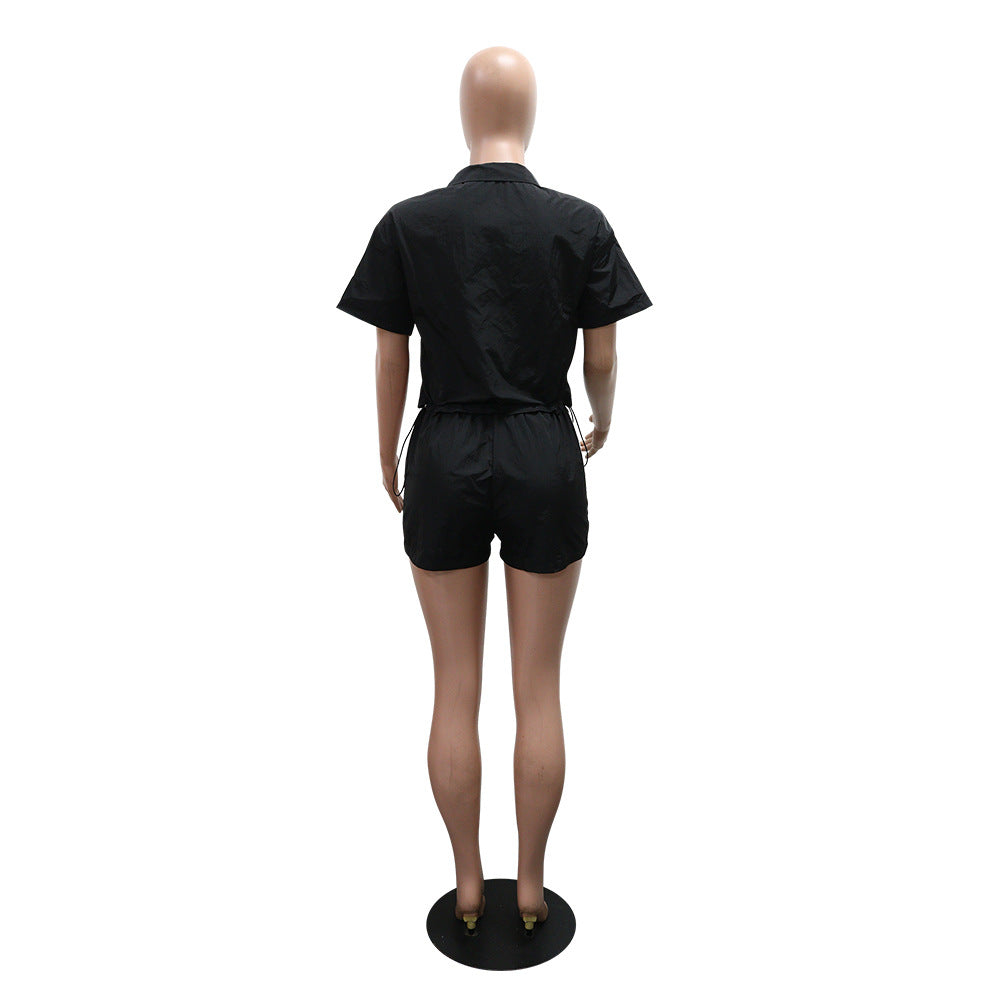 - Top: Short sleeve, collared, zip-up closure
