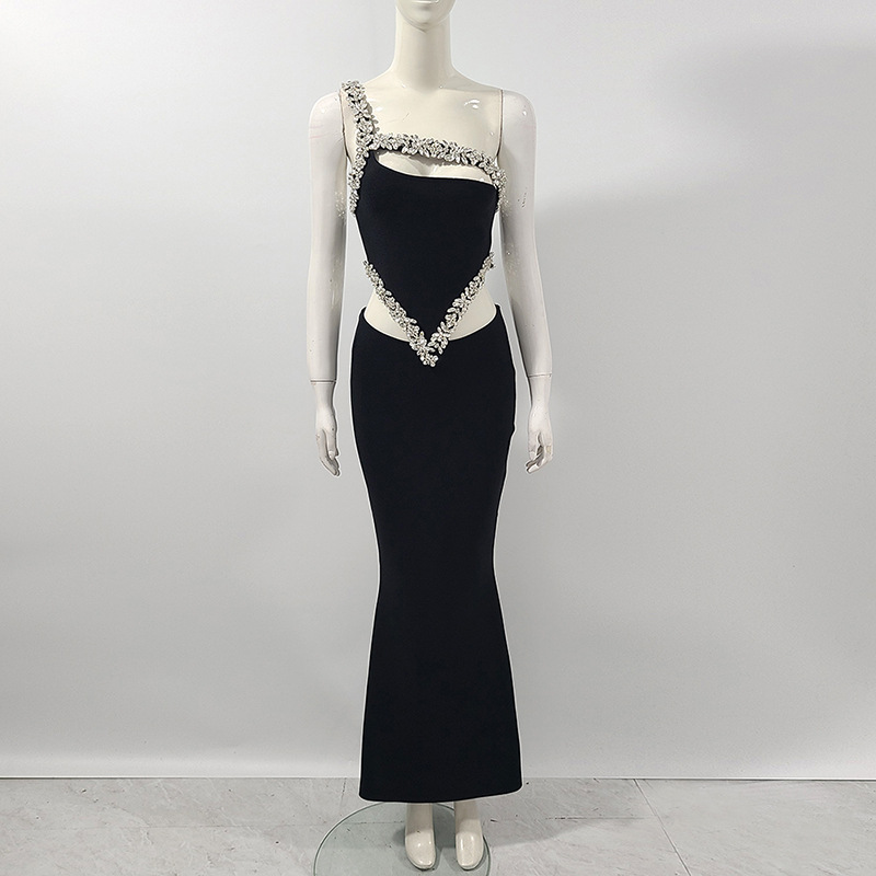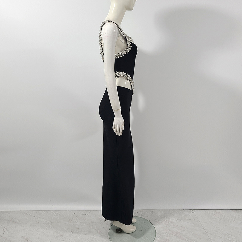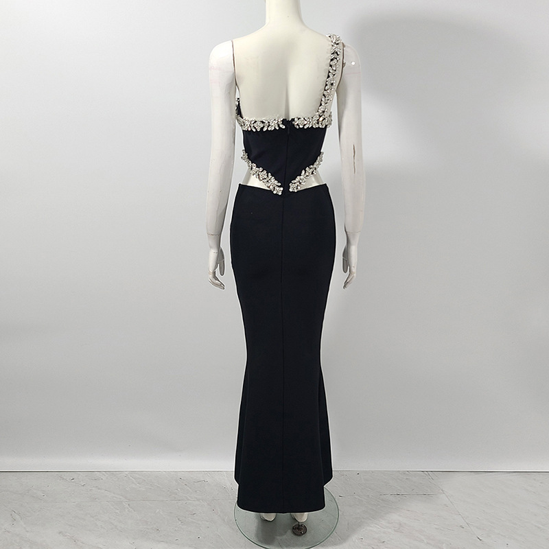 Introducing The Aura, a stunning rhinestone cutout gown that embodies both elegance and sexy sophistication. This seasonless maxi dress is designed for formal occasions and is crafted from premium polyester. Its slim-fit bodycon silhouette is beautifully structured to highlight your curves, providing a sleek and sculpted look.