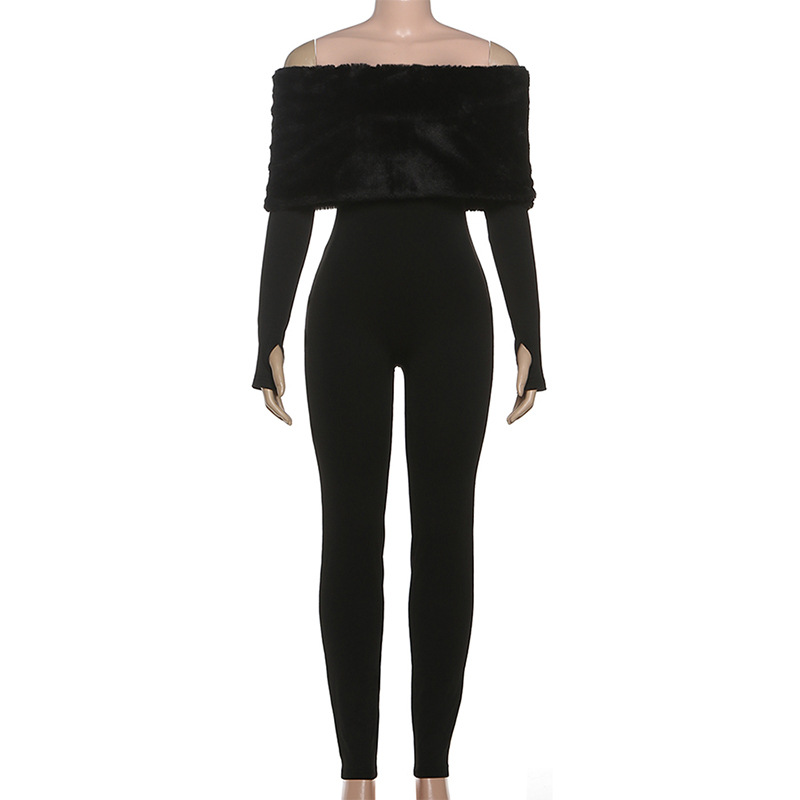 Women’s Off-the-Shoulder Slim Fit Jumpsuit – Long Sleeve Furry Patchwork Full-Length Party Outfit
