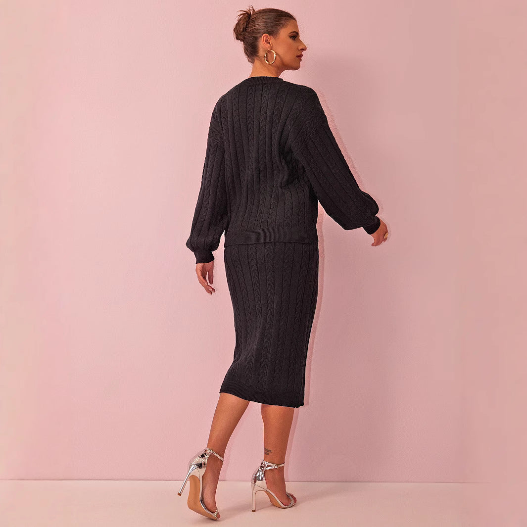Elevate your fall and winter wardrobe with this elegant twist stitch sweater and skirt set. Crafted from soft, breathable viscose-jersey, the set features a crew neck long sleeve sweater with functional pockets and a high-rise midi skirt, delivering both comfort and refined style.